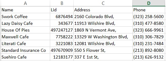 我已经写了一个脚本,是刮地址和电话号码的某些商店,根据名称和盖子。它搜索的方式是从csv文件中分别获取存储在A列和B列中的名称和盖子。但是,在基于搜索获取结果之后,我期望解析器将结果分别放在C列和D列中,如第二张图像所示。在这一点上,我被困住了。我不知道如何使用读写方法操作第三和第四列,以便将数据放在那里。我现在试着用这个: