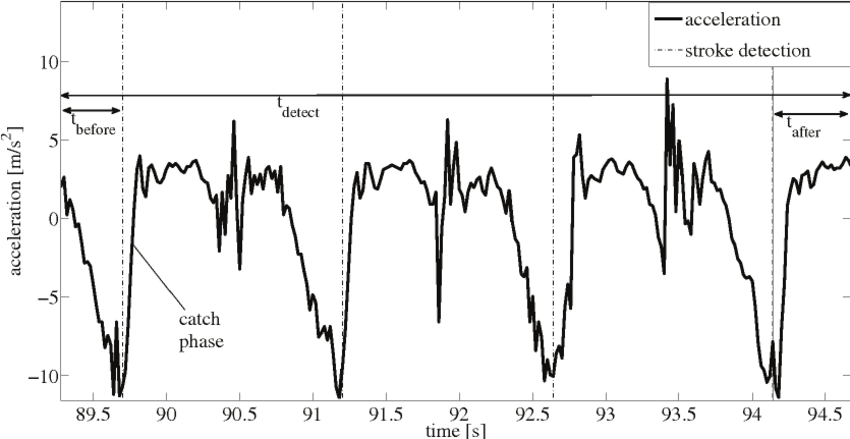 然后构建一个包含两个状态的状态机来检测每一次笔划。当加速度小于-9m/s^2时触发第一状态,当加速度大于0m/s^2时触发第二状态,当加速度介于两者之间时,状态不变。