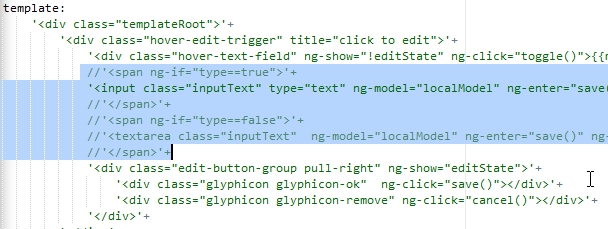 '<input class="inputText" type="text" ng-model="localModel" ng-enter="save()" ng-show="editState" />' +