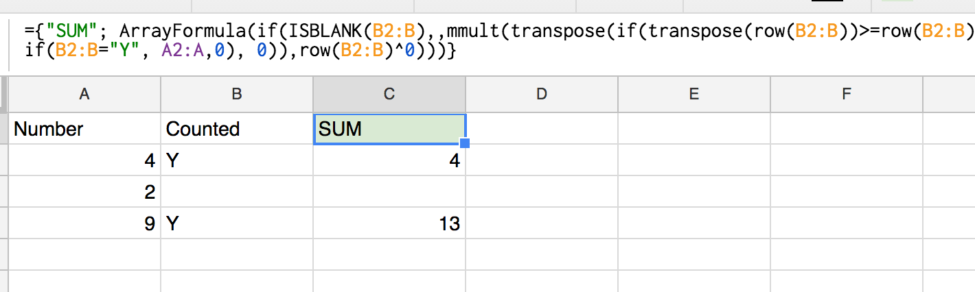 =ArrayFormula(MMult((Row(2:1000)>=Transpose(Row(2:1000)))*Transpose(A2:A1000*(B2:B1000="Y")), Row(2:1000)^0))发布于 2017-06-06 14:27:15