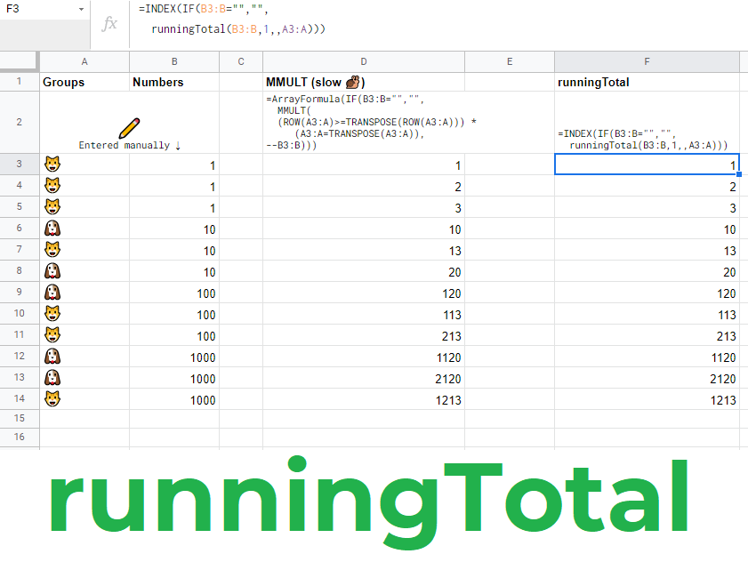 =INDEX(IF(B3:B="","", runningTotal(B3:B,1,,A3:A)))