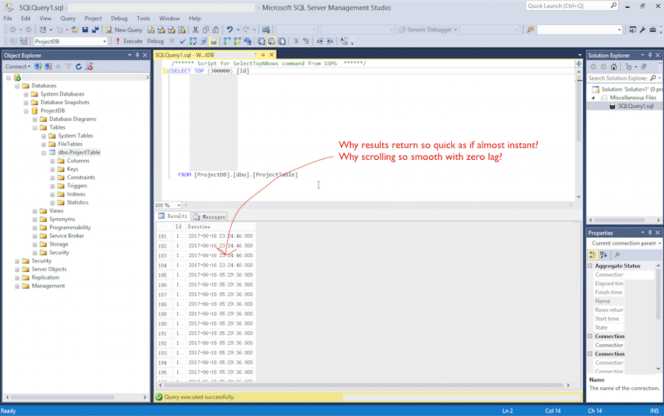 我注意到在SSMS ( 2016)中,查询结果在一秒内返回( 10k+行上方)。结果表/网格滚动非常平滑,在SSMS上内存占用极低(~80 an )。这种类似网格/视图的控制方式可以执行ListView (~200 10,2-3秒)和DataGrid (~600 10,8-10秒)。即使我关闭所有可视化或调整取消滚动或修复它的高度来优化速度,它们仍然在SSMS中远远落后于网格,仍然具有缓慢的滚动和GUI操作。