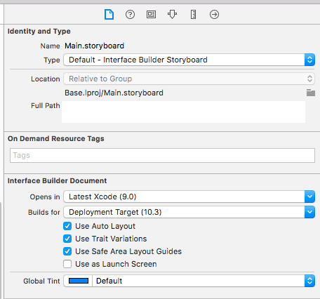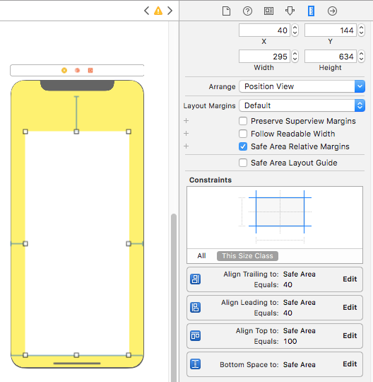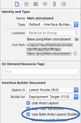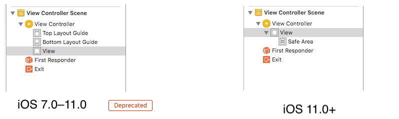 据苹果公司称,Xcode 9-发行说明 接口生成器使用UIView.safeAreaLayoutGuide作为UIViewController中不推荐的顶部和底部布局指南的替代品。若要使用新的安全区,请在“文件”检查器中为视图控制器选择“安全区布局指南”,然后在内容和新的安全区域锚点之间添加约束。这可以防止您的内容被顶部和底部栏以及tvOS上的过度扫描区域所遮蔽。当部署到早期版本的iOS时,安全区域的约束被转换为顶部和底部。