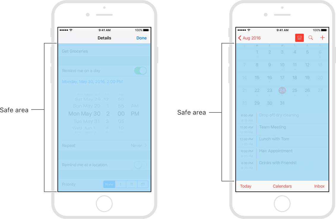当视图在屏幕上可见时,本指南反映视图中未被其他内容覆盖的部分。视图的安全区域反映了导航条、选项卡条、工具栏和其他祖先所覆盖的区域,这些祖先掩盖了视图控制器的视图。(在tvOS中,安全区包含由UIScreen的overscanCompensationInsets