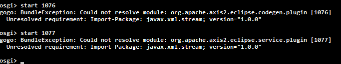 不幸的是,当我尝试启动它们时,我收到了这样的消息: BundleException:Could no resolve module: org.apache.axis2.eclipse.service.plugin [107X] Unresolved requirement: Import-Package: javax.xml.stream; version="1.0.0"