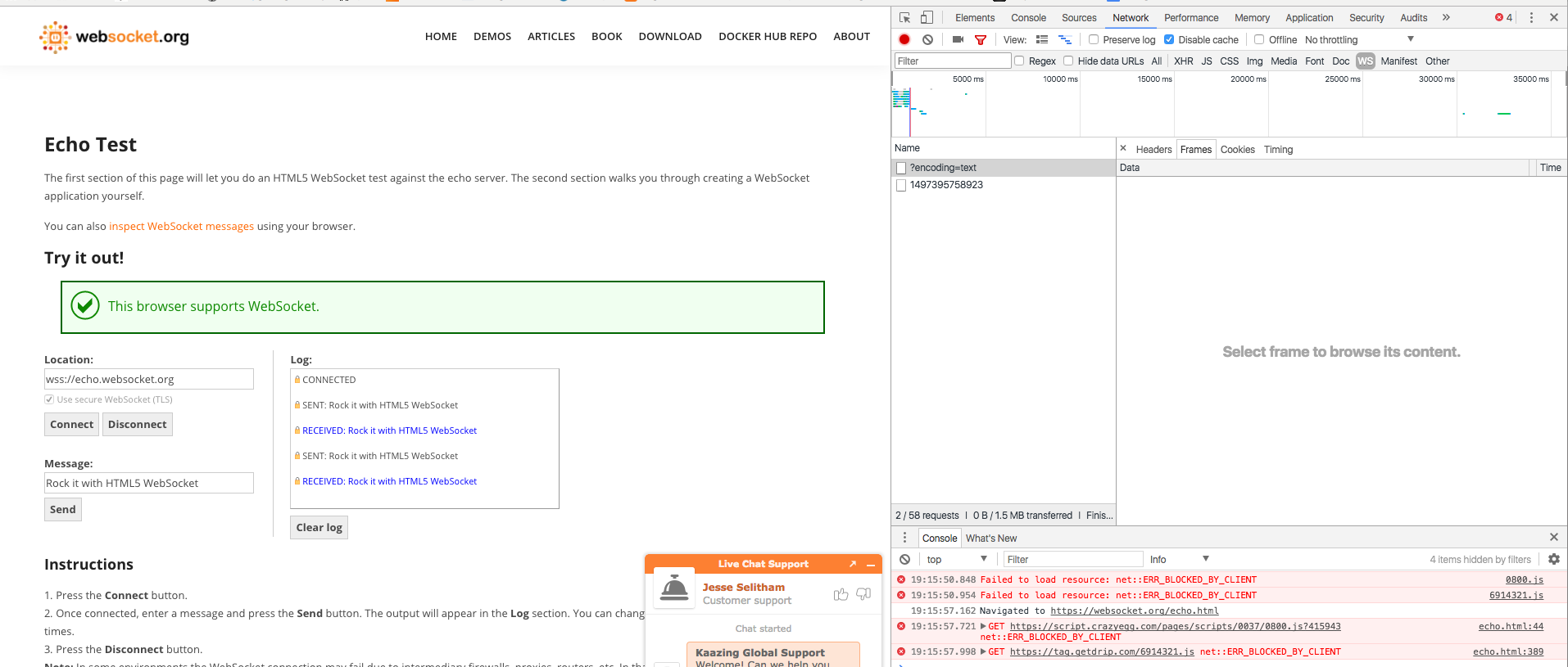 我想也许是我们在应用程序编码或协议中改变了一些东西,可能导致它没有出现,所以我在这里尝试了一个简单的测试:https://websocket.org/echo.html。