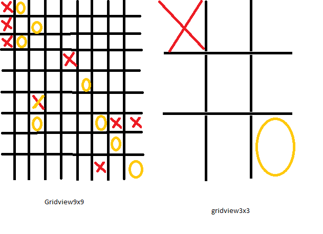 输入下面的代码--我使用的是2个网格视图,一个带有9X9单元格的网格视图,以及一个带有3x3单元格的网格视图。我用imageview
