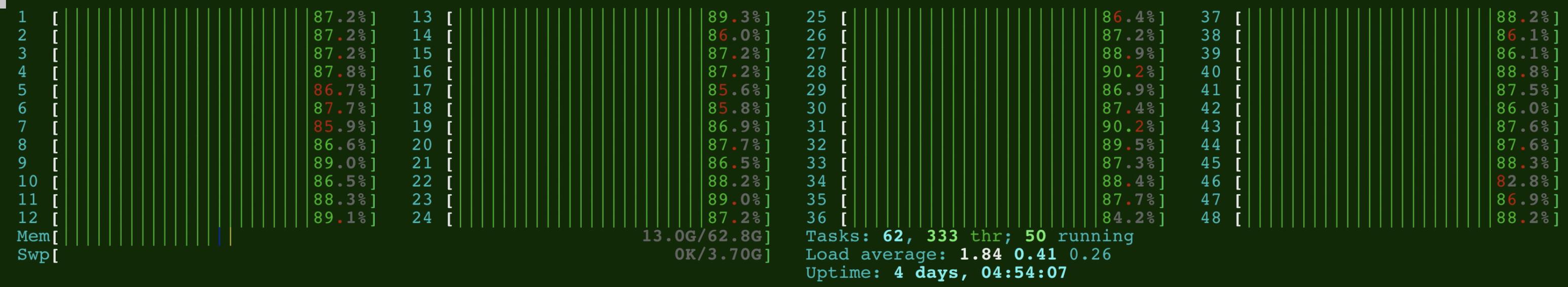 我遇到了一个类似的问题,我的代码使用并行流()。并行流的问题在于它使用了所有的CPU核心。我有一个由48个核心组成的系统下面是CPU利用率的屏幕截图。