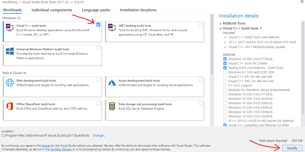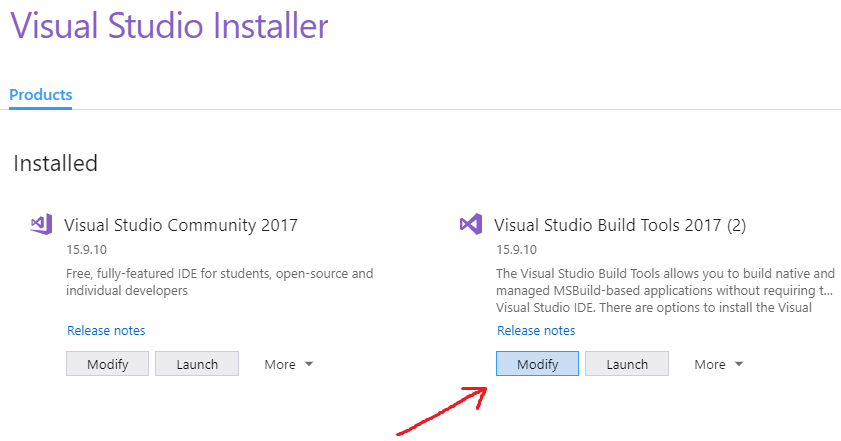 如果您已经安装了,但仍有此错误,则可能需要“修改”您的安装,以包括VisualC++生成工具。