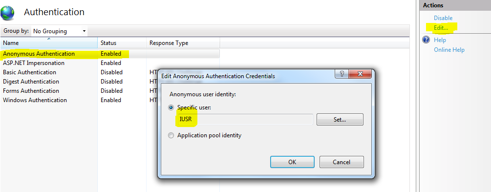 默认情况下,您的asp.net代码以Application的身份运行,但是静态文件(html、js、css等)将使用身份验证设置中的用户凭据。