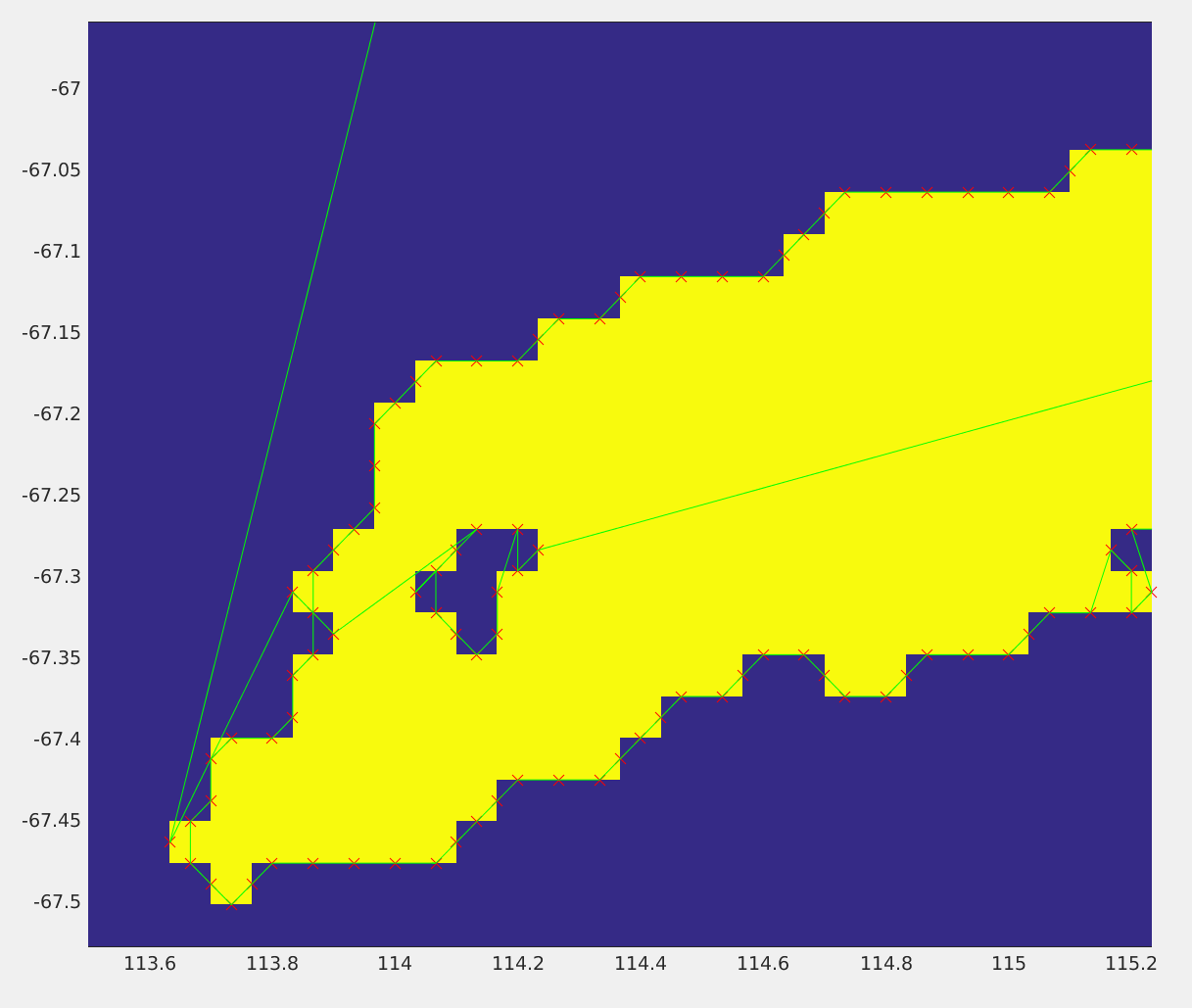 正如你所看到的,这是一个复杂的轮廓,向“西南”方向前进,然后绕回来“东北”。这是我想画的红线,穿过黑点: