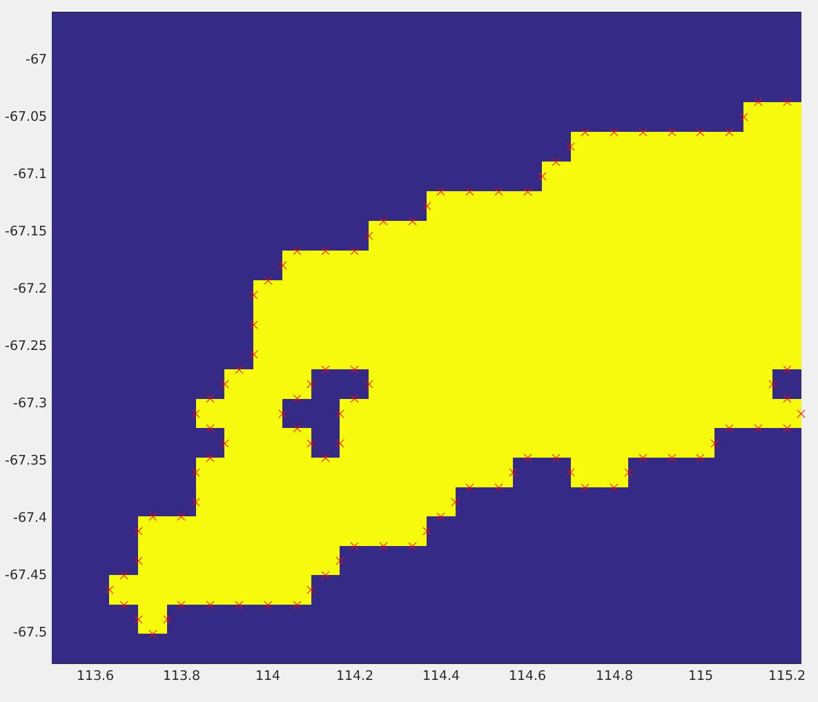 请注意,这是一个pcolor图,所以每个‘正方形’本质上是一个像素。我想返回一个轮廓,它跟随黄色数据像素的脸,而不是--仅仅是黄色数据的边缘。