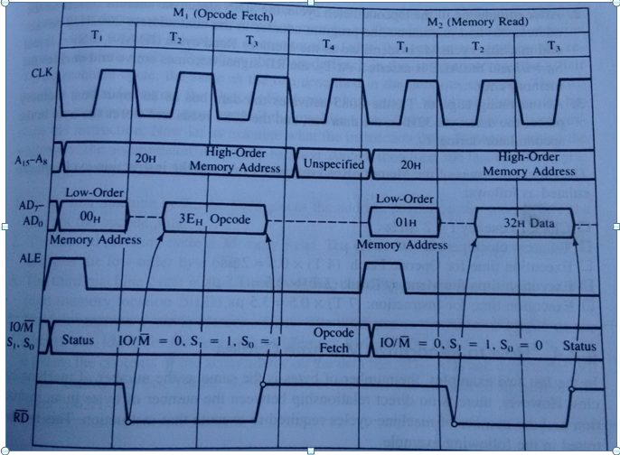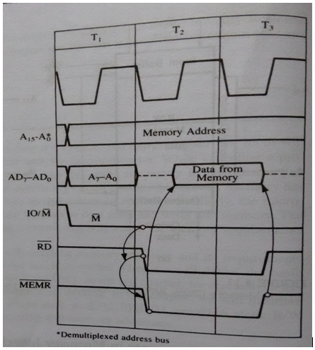 在另一个主题内存接口中,本书显示了内存读取周期的时序图。这里,8085提供了两个信号- IO/M(bar)和RD(bar)来指示它是一个存储器读取操作。IO/M(bar)和RD(bar)可组合生成MEMR(bar) (存储器读取)控制信号,该控制信号可用于通过连接到存储器信号RD(bar)来启用输出缓冲器。在T2期间,内存将地址寄存器中的数据字节放置在T2结束之前由微处理器读取。为什么在图中有从IO/M到RD和从RD到MEMR的箭头?