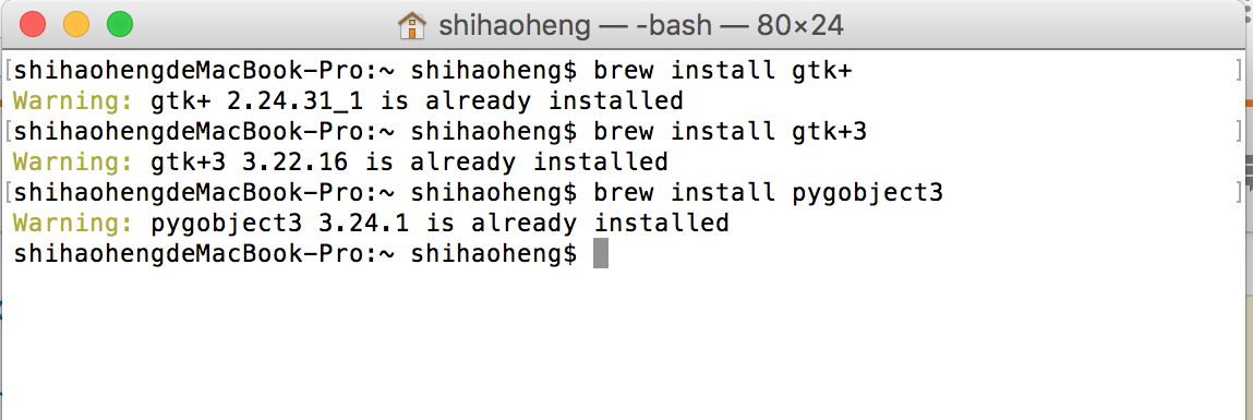 Gtk+2、Gtk+3和pygobject3都已经安装到我的mac上,使用的是自制的: