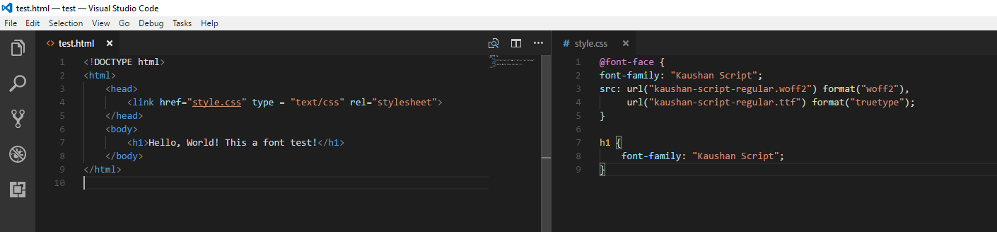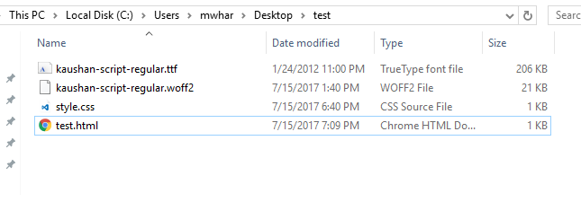 所有内容都位于一个名为“test”的文件夹中,@字体面板src引用了我想测试的本地.woff2字体文件。不幸的是,除非我使用.ttf字体文件,否则标题的字体不会显示正确的字体。