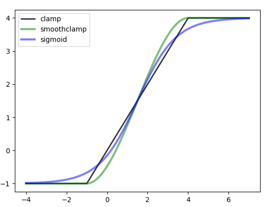 return result它简化为给定N=0的常规钳位函数(0倍可微),并随着N的增加而增加平滑度,您可以像这样显示它: