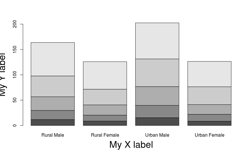 barplot(VADeaths, xlab = "My X label", ylab = "My Y label", cex.lab = 2)