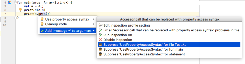 在我的项目中,我有一个委托(用Java编写),用于通过RPC获取数据,其中大多数方法以'get‘开头,有些方法不需要参数,因此Kotlin建议用属性访问语法替换对它们的调用,而它们不满足属性语义(因为它们执行网络请求),所以我想禁止对所有这些方法默认使用的方法进行检查,而不是代替每个调用(是的,我知道块的@Suppress注释,它的工作原理与我所需要的完全相反)。