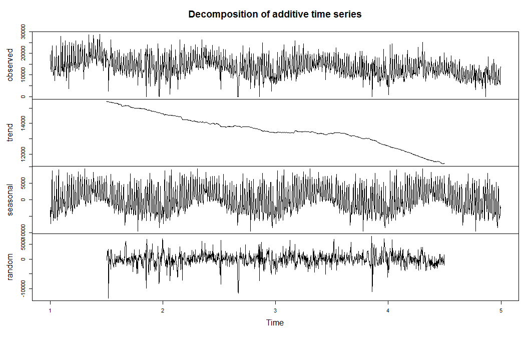 ts <- ts(mydata, frequency = 365)然后通过分解进行初步分析:
