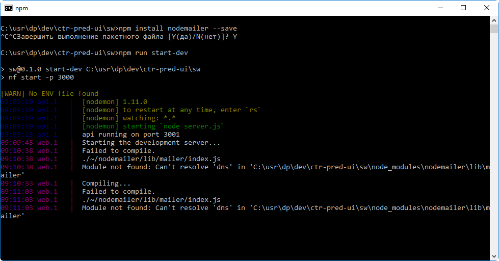 更新1 (30.07.2017 09:12 MSK): Nodemailer不工作--我得到了错误09:11:03 web.1 | Module not found: Can't resolve 'dns' in 'C:\myproject\node_modules\nodemailer\lib\mailer'。