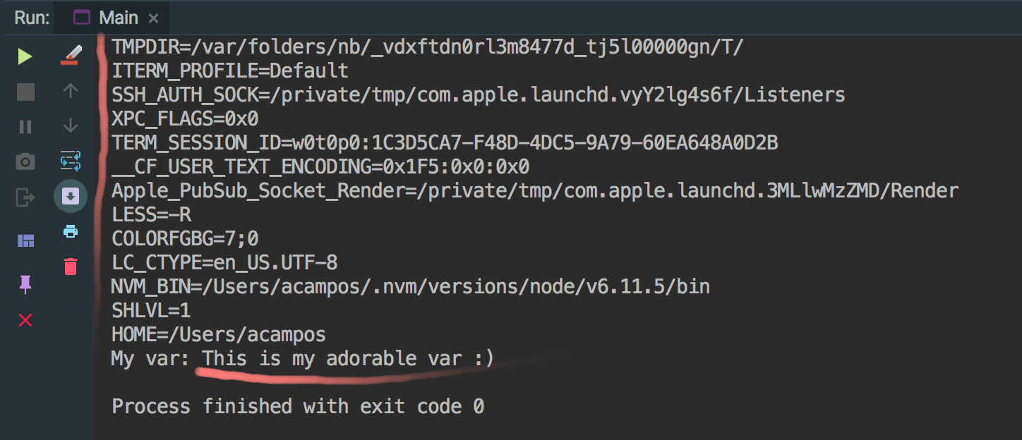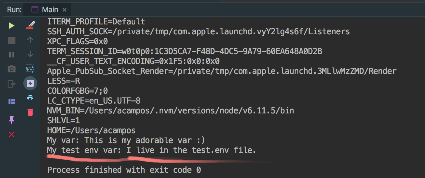 $ env-cmd test.env idea然后编辑您的程序以显示"MY_TEST_VAR",并运行它,您将在IntelliJ的控制台上看到如下内容: