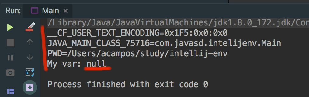 } 这个程序基本上加载所有环境变量,在控制台上显示它们,并尝试显示env变量。此外,它还假设您在调用 IDEA之前已经创建了MY_VAR env变量,方法如下: