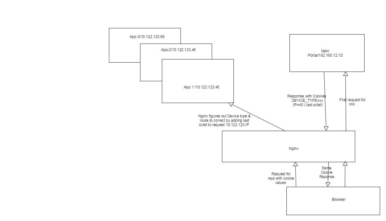 浏览器向nginx发送请求,只需看到设备类型和IP最后一个八位数值,就可以重定向到正确的应用程序。所有进一步的请求都将根据cookie值和nginx的规则进行更正。