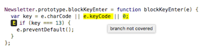 您还没有测试过e.charCode是falsey而e.keyCode是真实的情况。您还没有为e.charCode和e.keyCode都是falsey时编写测试。为这两种情况编写测试,您的测试将覆盖所有分支。