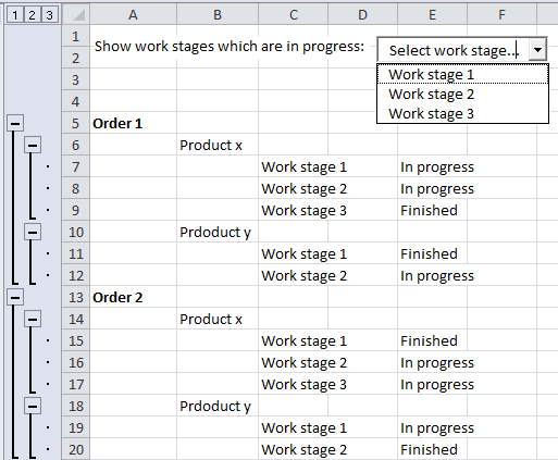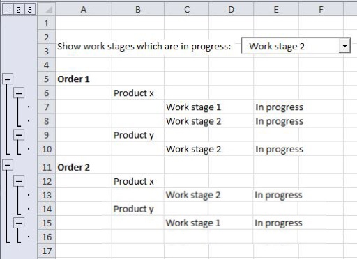 此代码只显示正在进行的选定工作阶段。我希望产品行、订单行和进度阶段前面的所有行都是可见的。