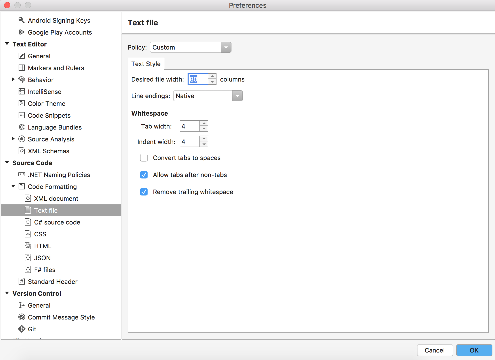 您可以在“首选项”对话框中配置此选项。选择“源代码-代码格式”。然后选择要配置的文件类型。大多数代码格式样式都是从文本文件继承的,因此您可能只想选择它。