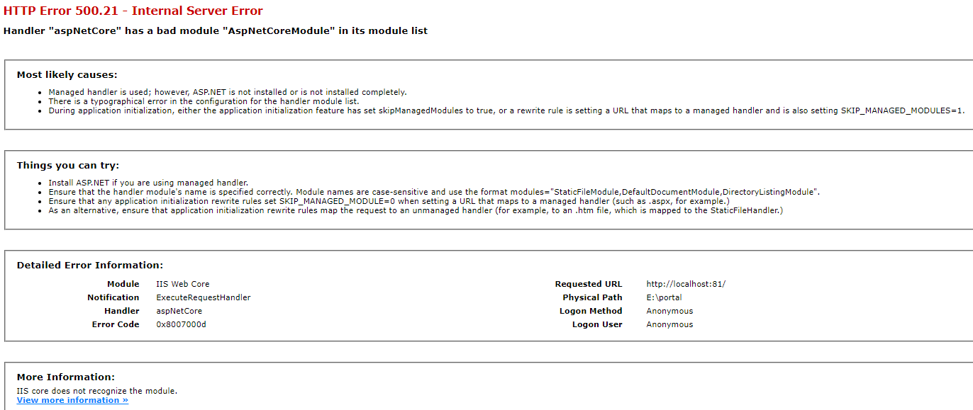 如果您使用的是dotNet内核,并且在配置服务器运行IIS之前安装了dotNet内核托管包,则可能会出现此错误。