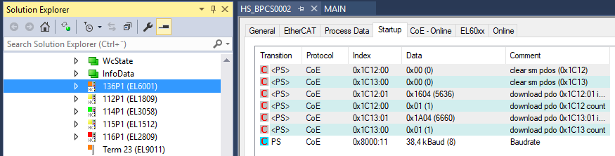 然后,通过使用来自EcCoESdoWriteEx库的邮箱写入块( Tc2_EtherCAT ),可以将值写入该参数。因此,当您的PLC程序启动时,首先运行将变量更新为所需波德率的代码。