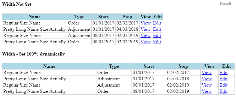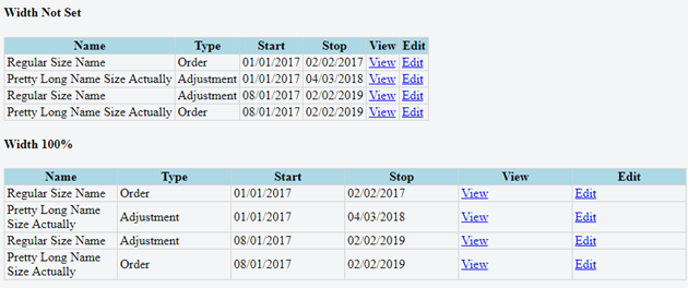 。当然,您可以在每个列上设置精确的像素或百分比维,以使其相对于其他列进行缩放,但这就开始对每个列的大小进行一些猜测。在这种情况下,只有View或Edit链接的列可以非常小,并且不需要占用任何额外的空间,而有些列可能需要更多的空间来增长,比如名称/类型,它可能具有其他更长/更短的值。