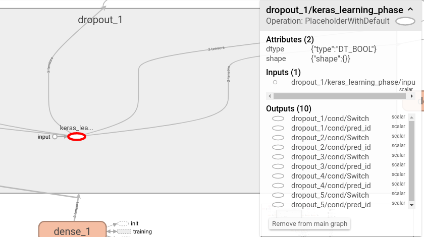 只有在我们训练模型的时候才会应用辍学。这应该在我们评估/预测的时候停止。为此,keras创建一个learning_phase占位符,如果我们正在训练模型,则设置为1.0。此占位符在您创建的第一个Dropout层中创建,并在所有这些层之间共享。这就是你在那里看到的!