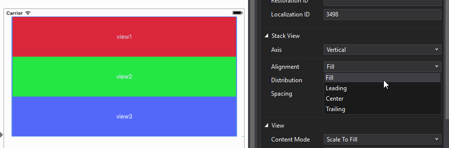 正如您所看到的,stackView的对齐将应用于其上的所有控件,而不是单个控件。