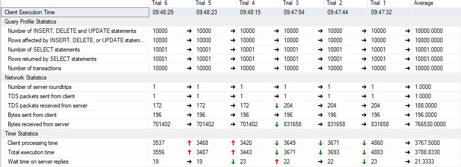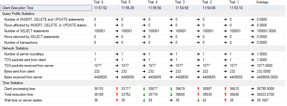 我第二次运行这个测试,但现在有100 k调用,还增加了SET NOCOUNT。以下是研究结果: