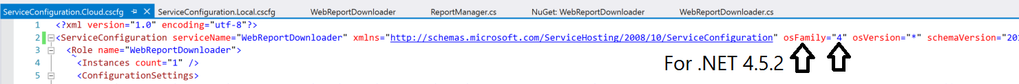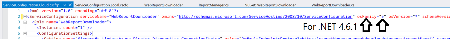 <ServiceConfiguration serviceName="WebReportDownloader" xmlns="http://schemas.microsoft.com/ServiceHosting/2008/10/ServiceConfiguration" osFamily="4" osVersion="*" schemaVersion="2015-04.2.6">