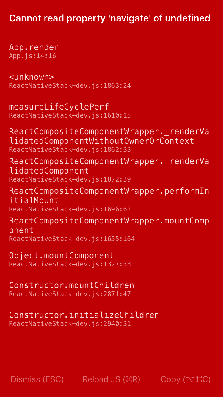 我目前正在开发一个应用程序,该应用程序与react本机协同工作,我试图使用react-navigation开发这教程,但我在运行项目时遇到了困难,我做了很多研究,我只是无法找到解决方案,首先,我使用的是react原生-cli: 2.0.1和react原生: 0.48.3,这是我的代码: