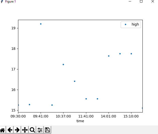 df_high.plot.scatter(x='time', y='high', c=None, s=None)