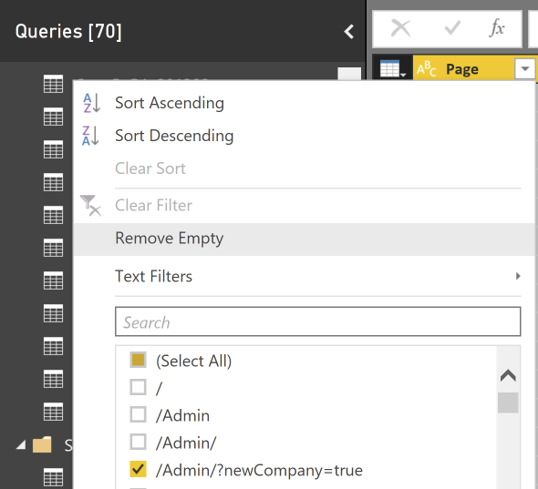 #"Filtered Rows" = Table.SelectRows(#"Added Items", each ([Page] = "/Admin/?newCompany=true"))