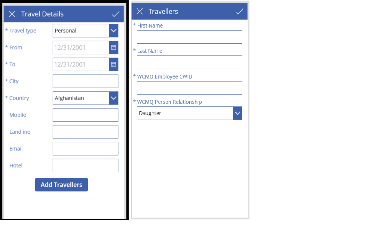 当旅行详细信息保存在第一个屏幕上时,我建议将旅行详细信息ID (或旅行详细信息表的主键是什么)存储为一个变量(上下文或全局变量,具体取决于您想要这样做的方式),然后修改第二个屏幕上保存按钮的OnSelect属性,以便在将该变量写入旅行者表时包含该变量中存储的信息。我意识到这不是很清楚,但更多关于数据结构和两个保存按钮的当前OnSelect属性的信息将有所帮助。