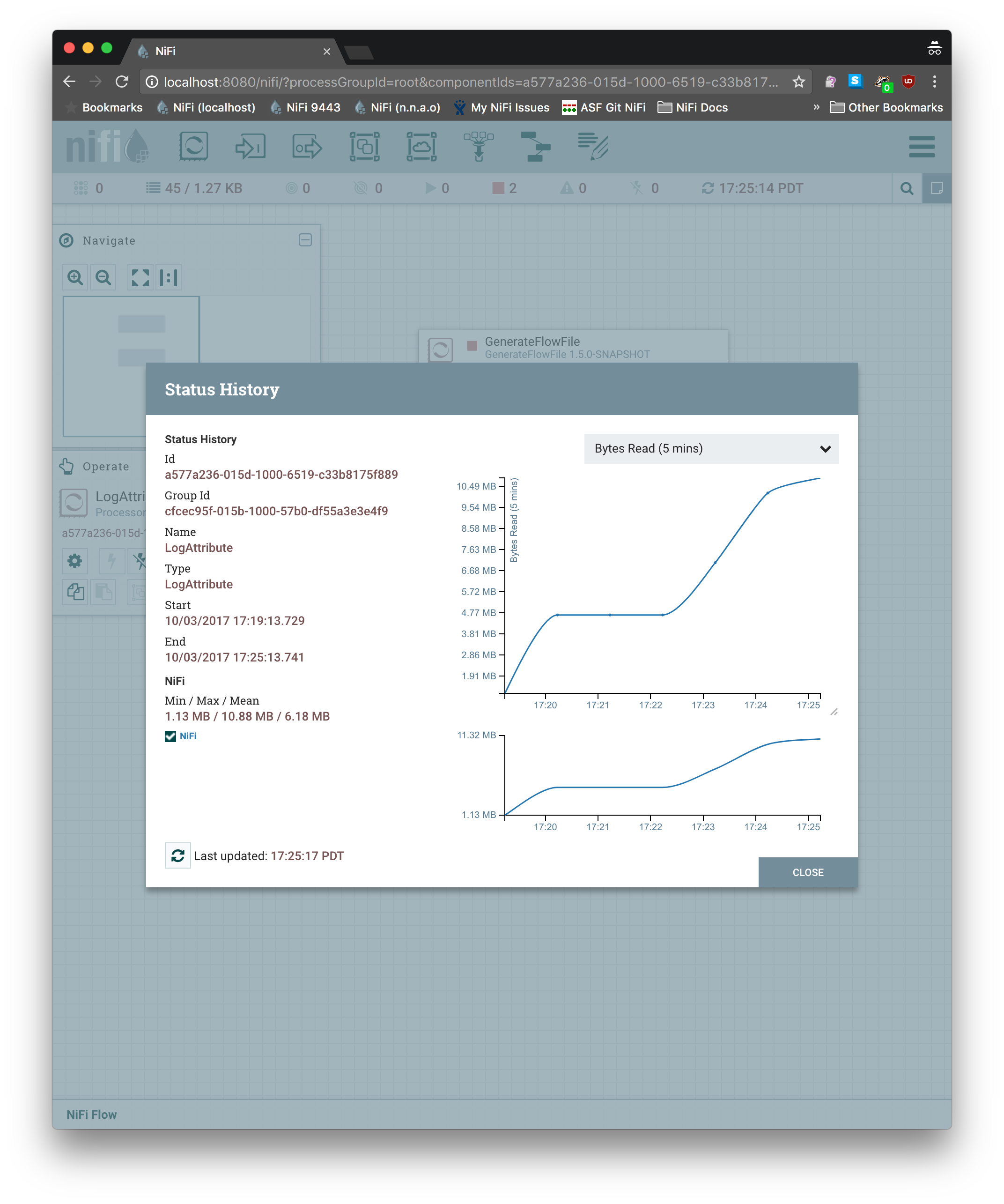 我刚刚在我的本地1.5.0开发分支中做了一个快速测试--我把一个简单的GenerateFlowFile连接到一个LogAttribute处理器上,这个简单的运行着0 sec计划的程序。GenerateFlowFile立即生成如此多的流文件,以至于队列启用了背压特性(暂停输入处理器直到队列可以耗尽10,000个等待的流文件)。我停止了这两个操作,并重新运行它,给LogAttribute处理器带来了更多并发任务。通过将LogAttribute并发任务设置为GenerateFlowFile的2:1,队列从未建立过大约50个排队流文件。