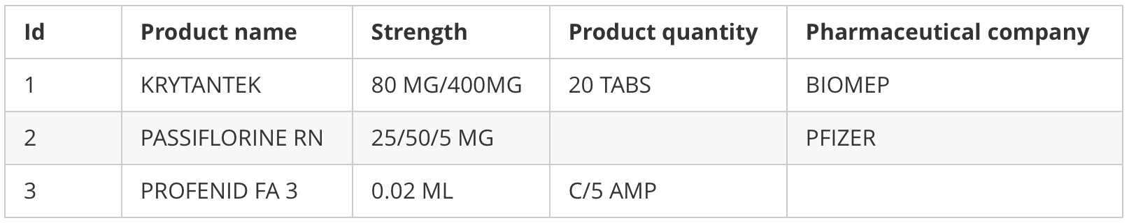 从存储药品说明的表格中,我需要识别每个条目的产品名称、强度、产品数量和制药公司。目标是拥有一个具有预定义结构的表的副本。