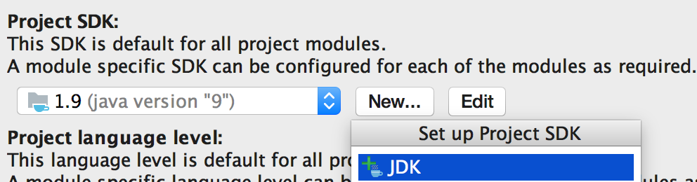 Java HotSpot(TM) 64-Bit Server VM (build 9+181, mixed mode)但是,当我想要在IntelliJ中执行一个新项目或更改我当前项目的Java版本时,我只能选择ModuleJava1.8.有人知道我怎么升级这个吗?我打赌这很容易,但我在网上找不到任何解决办法.它们只展示了IntelliJ中java 9的新特性,以及它100%支持的特性。