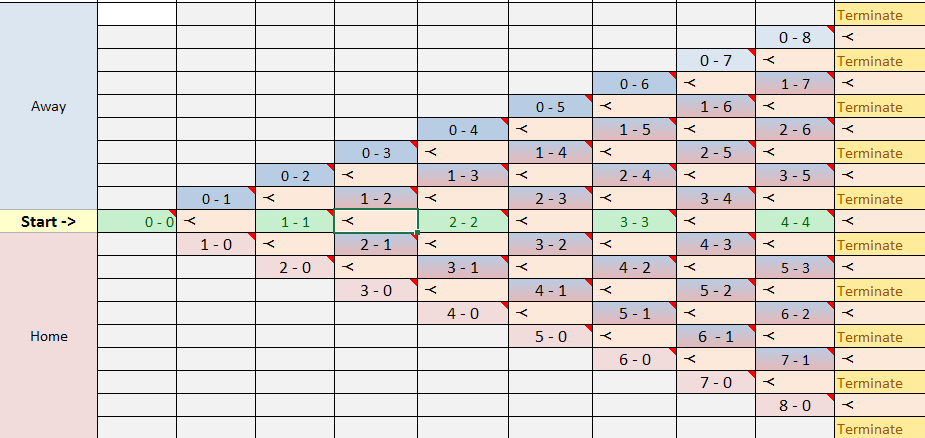 正如你所知,足球是一种球门事件游戏,一旦进球,我就进入树中的下一个节点。所以0-0的分数是起点。然后,该节点分裂为2个节点(1-0)和(0-1)。一旦上了一条路,树就需要迎合沿着这条路行驶的需要,但也要满足2-2,3-2,3-3等的需求。