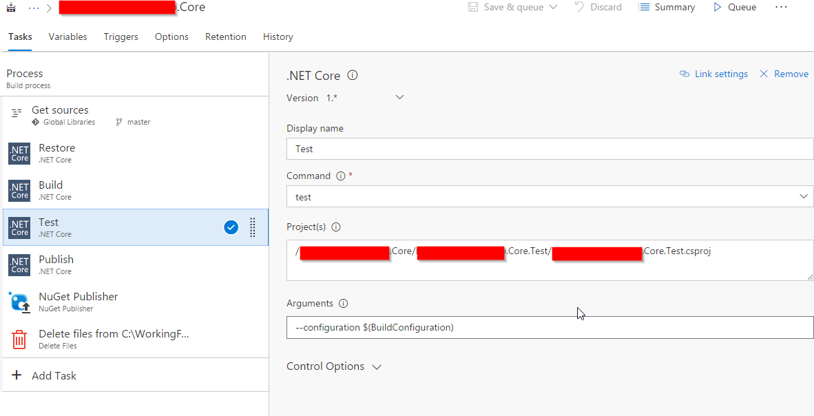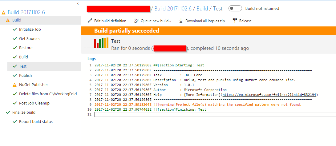 VSTest任务不能运行.NET核心测试,因为它使用了测试平台版本1。要运行.NET核心测试,我们建议使用带有测试命令的.NET核心任务。