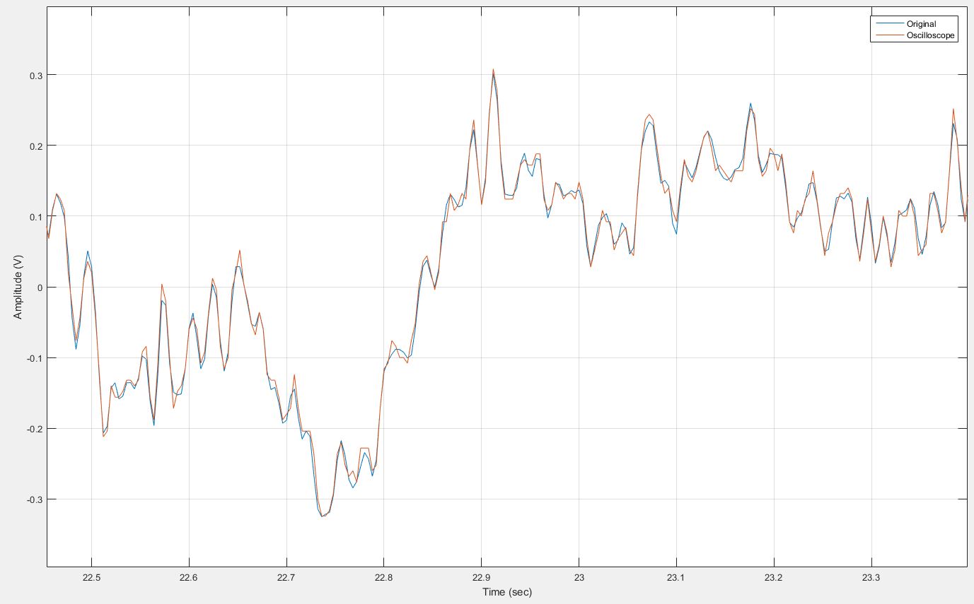我在Matlab中有一个信号的文本文件。我把信号加载到波形发生器上,然后在示波器上记录发生器的输出。我把示波器记录的信号输入Matlab。原始信号与示波器信号的皮尔逊相关系数为0.9958。