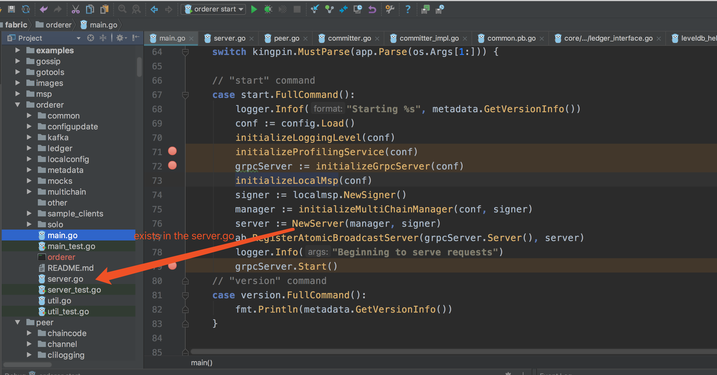 当我用Goland 1.0 EAP IDE调试fabric源代码orderer模块时,它可以调试并提示如下: