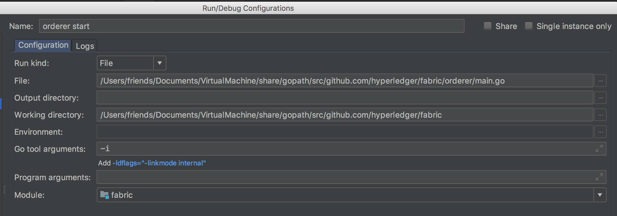 在运行配置屏幕截图中,Run种类值是File。这意味着GoLand将只运行该文件。将其更改为package,并更改包名选项,该选项现在将显示为指向正确的包,在这种情况下,github.com/hyperledger/fabric/orderer