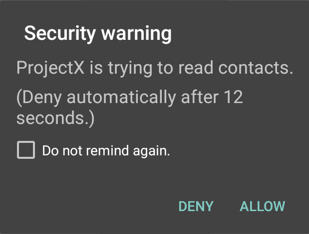 我为android 6做了几次运行时预演,但是每次重新启动设备或按一下按钮来服务,就会出现一个对话框,显示系统警报,并在上面读取联系人权限。我的应用程序工作在后台(重新启动后广播调用的服务)--这是第一个权限,我注意到,在它上不再有“永不再问”选项,